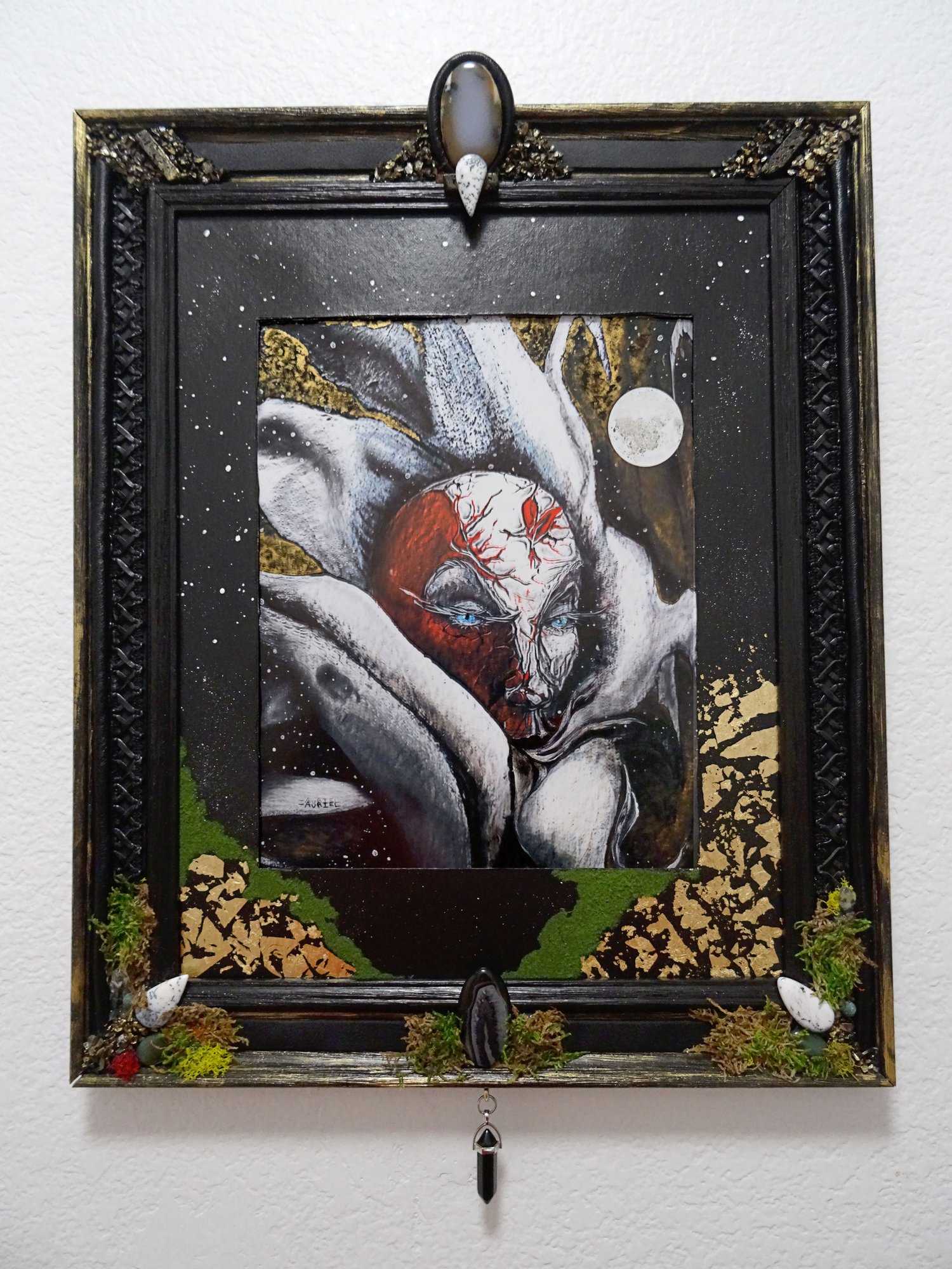 Mixed-media on medium weight cold press illustration board with obsidian, braided trim, Custom steel pendant custom frame.