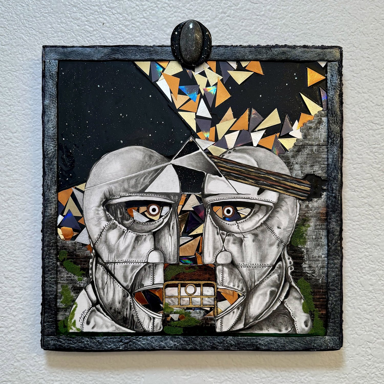 Mixed-media on canvas, custom frame, and gemstone.