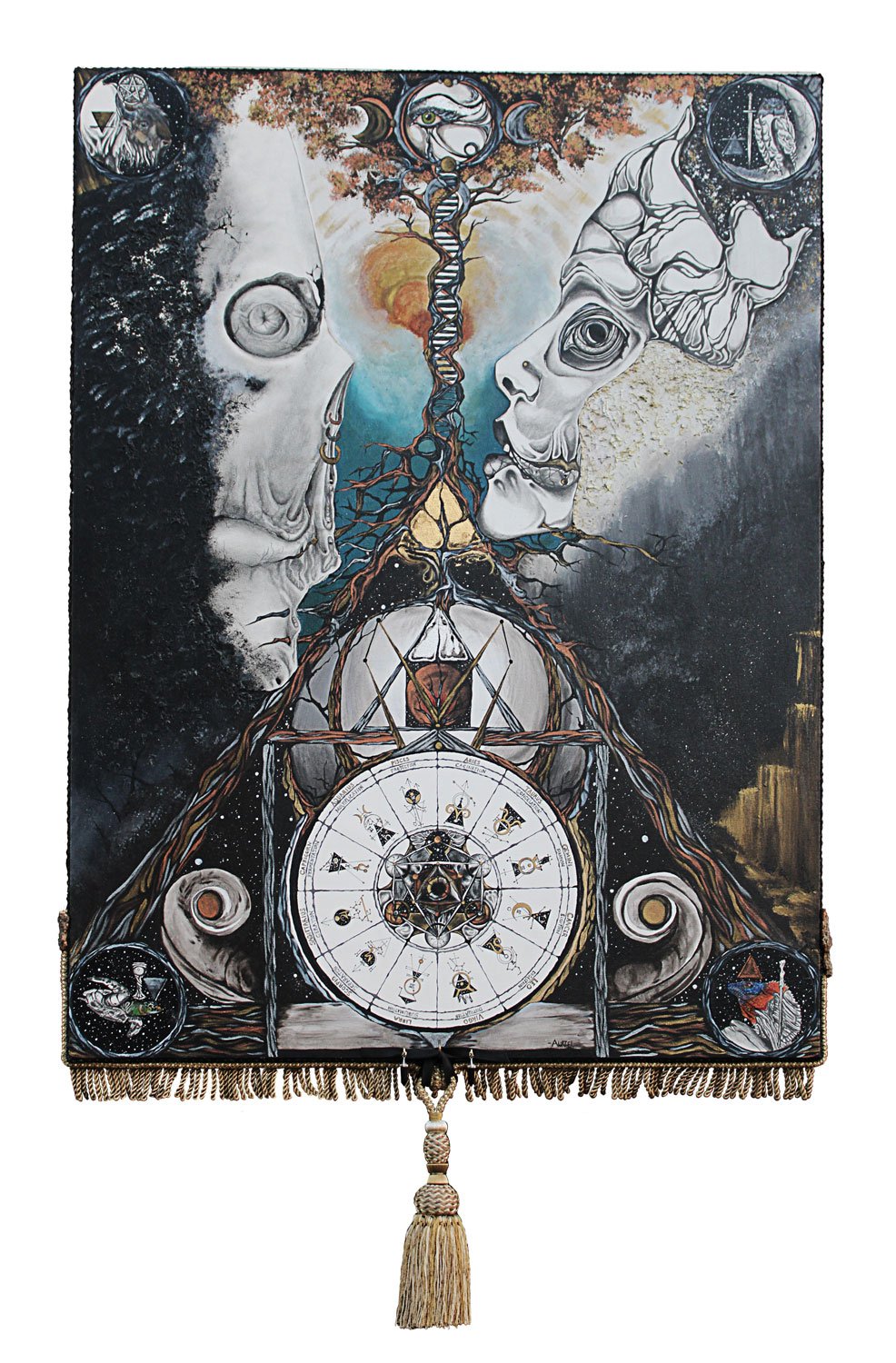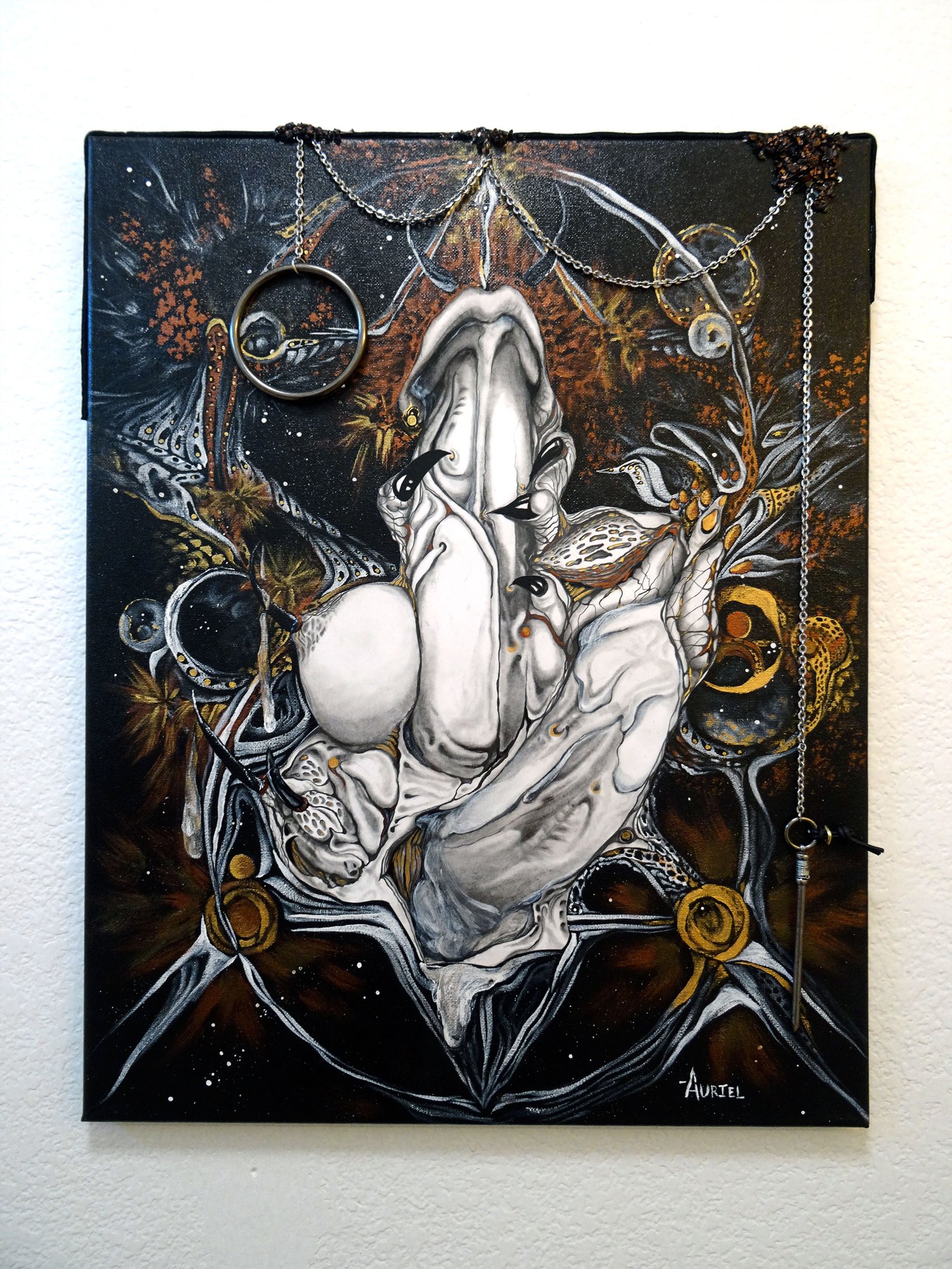 Mixed media on canvas with gemstones and steel pendants.