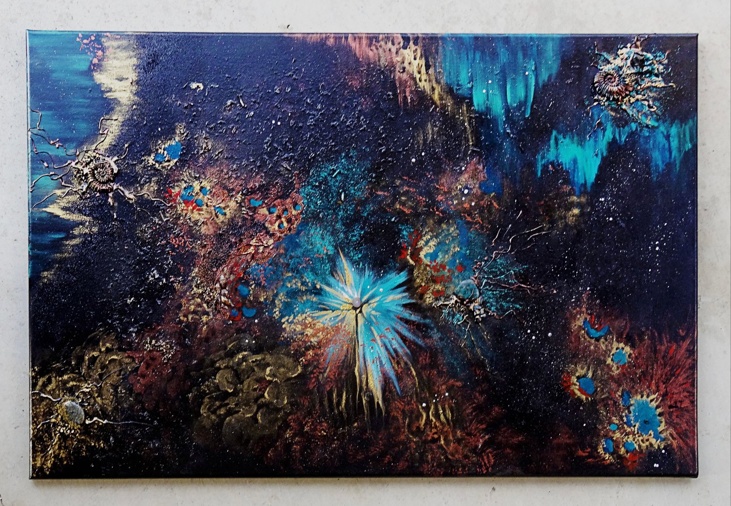 Mixed media on canvas with gemstones.