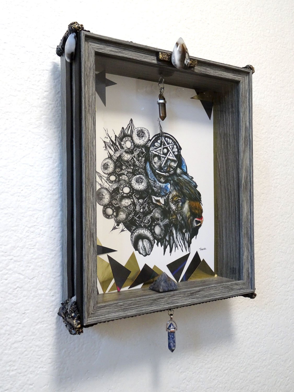 Mixed-media gemstone frame and painted print.