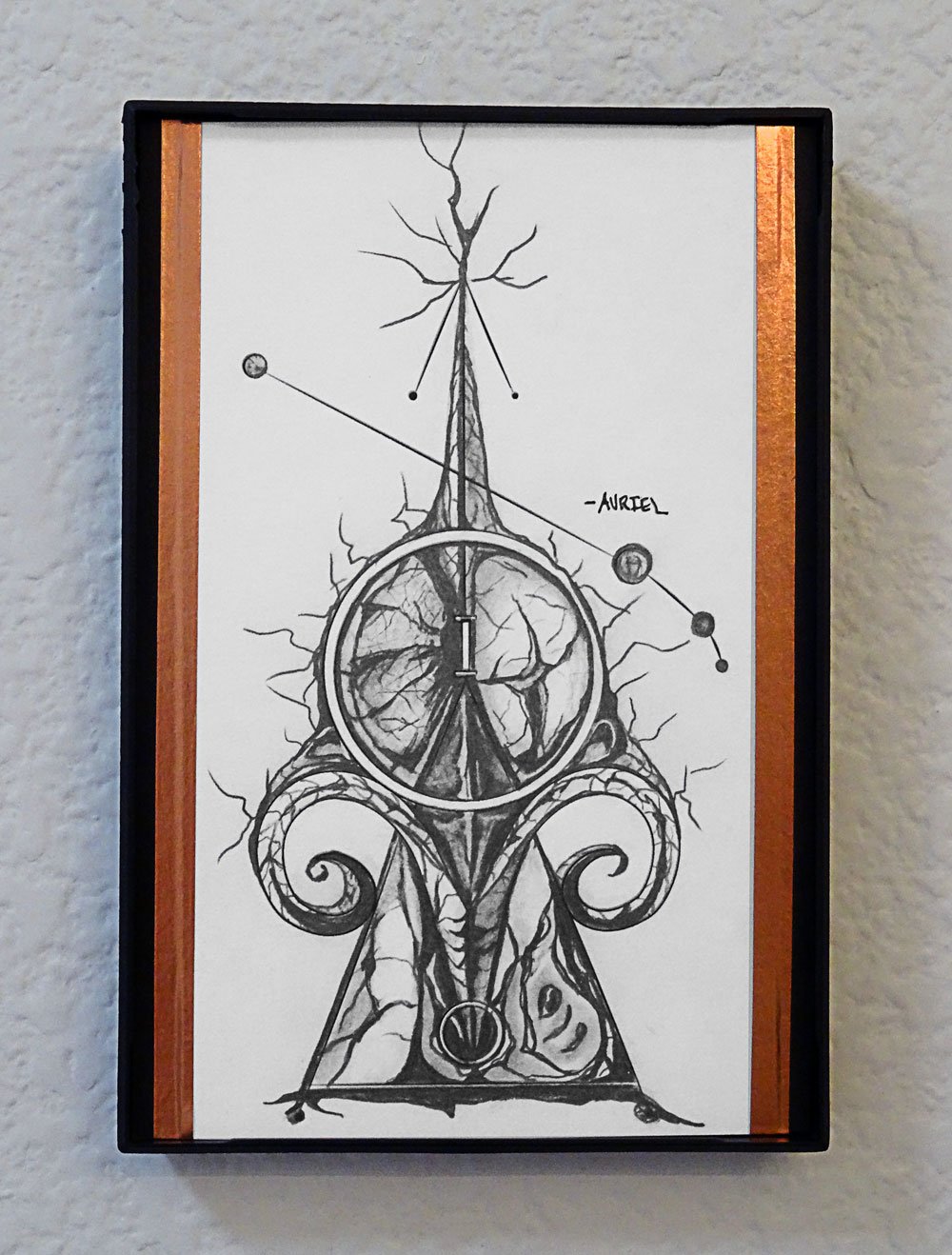 Mixed-media Sculptural Framed Graphite Drawing with tektite and other natural elements.